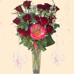 Price: $151.99A Dozen Long Stem Red Roses One Peony In The Middle Bouquet
