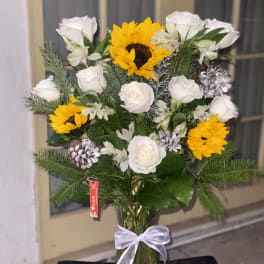 Price: $116.99 Winter Elegance Snow Ranunculus Frosty Pine Cone Cube Vase Product Tags: Same-day Delivery