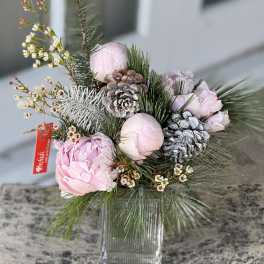 Price: $128.99 Pink Peonies & Pinecone Winter Elegance Cube Vase Arrangement Product Tags: Same-day Delivery