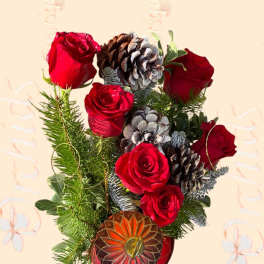 Price: $85.99 Beautiful Red Roses Pinecones Ornament Arrangement Product Tags: Best seller Same-day Delivery