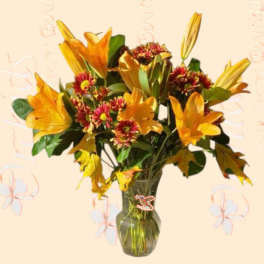Price: $102.99 Yellow Lilies Tulips Hydrangea Modern Spring Garden Arrangement Product Tags: Same-day Delivery
