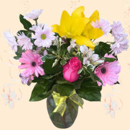 Price: $80.99 Short Stem Yellow Roses Lavender Daisies Hand Wrapped Bouquet Product Tags: Same-day Delivery