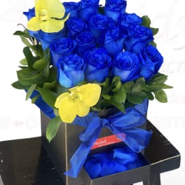 Price: $190.99 Blue & White Hydrangea Roses Orchids Garden Podium Arrangement Product Tags: Same-day Delivery