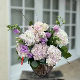 Price: $190.99 Blue & White Hydrangea Roses Orchids Garden Podium Arrangement Product Tags: Same-day Delivery